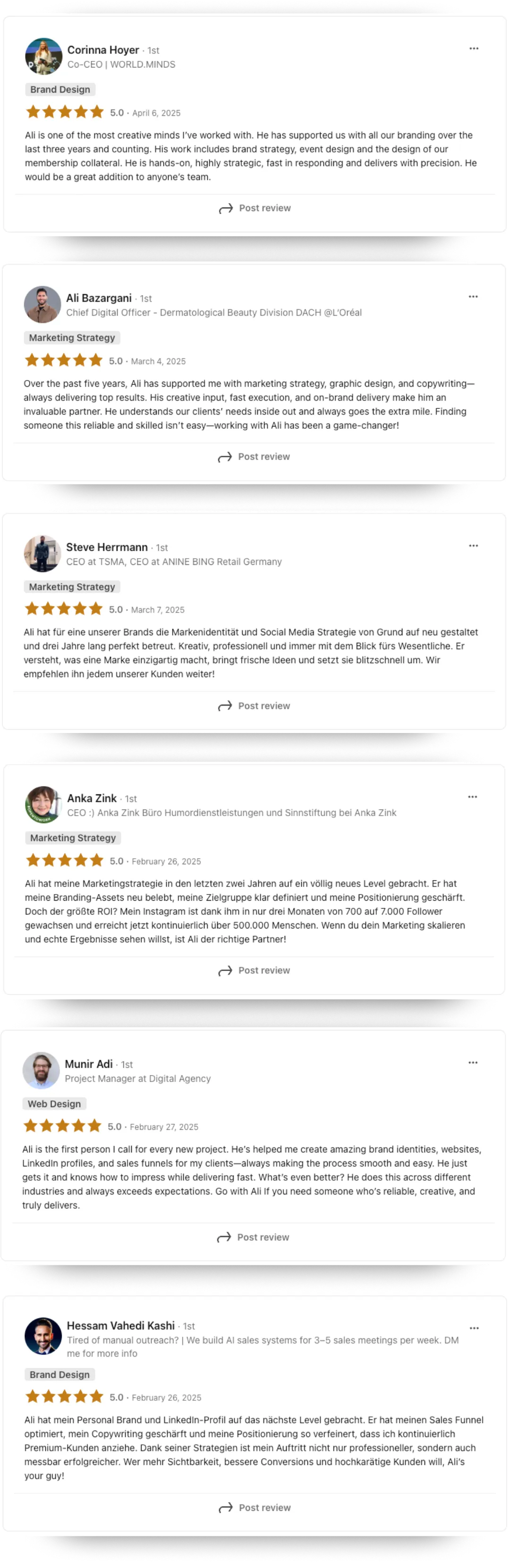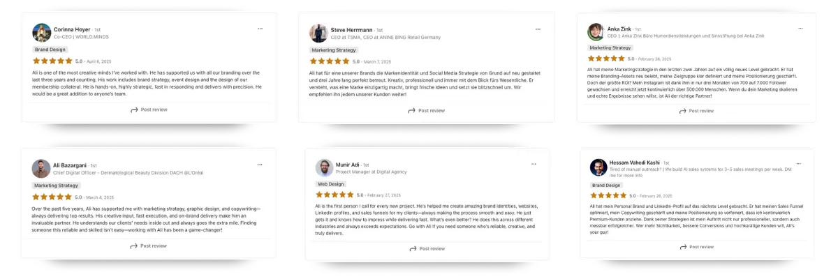 Ali hat mehr als 50 Unternehmen, Persönlichkeiten und Marken dabei begleitet, sich digital klar zu positionieren, sichtbar zu werden und Kunden online zu begeistern.